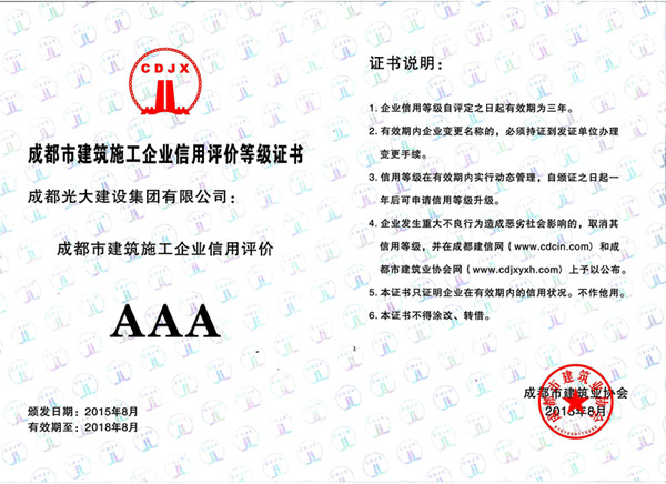 2015年8月公司被成都市建筑業協會評為“成都市建筑施工企業信用評價AAA”企業