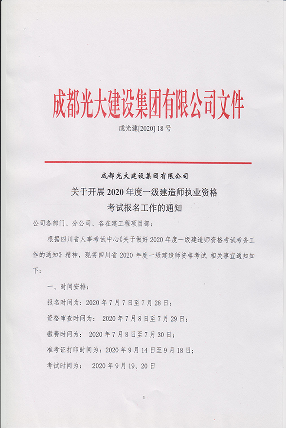 成光建【2020】18號文-關于2020年一級建造師執業資格考試報名的通知