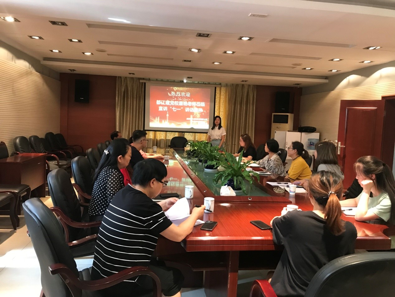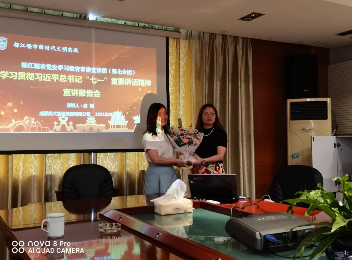 根據黨中央和省委、成都市委關于認真學習貫徹習近平總書記在慶祝中國共產黨成立100周年大會上重要講話精神工作部署和《中共都江堰市委辦公室關于學習貫徹習近平總書記在慶祝中國共產黨成立100周年大會上重要講話精神的通知》(都委辦〔2021〕8號)要求,市委組建了“兩新”宣講團,安排市委黨校老師到公司開展對象化、分眾化、互動化基層宣講。9月10日下午兩點,都江堰市黨校唐艷老師蒞臨公司五樓會議室,為公司全體員工宣講習近平書記“七一”重要講話精神。